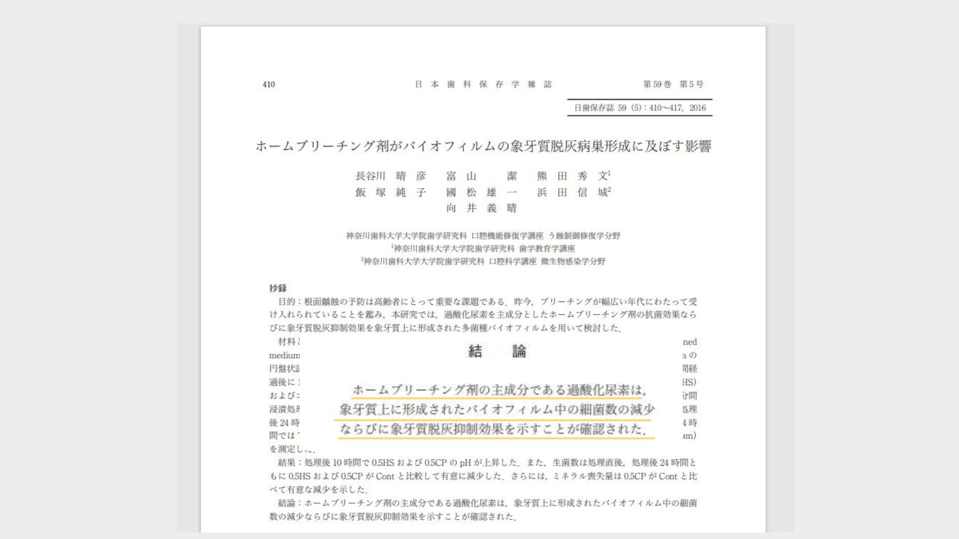 ホワイトニング作用は過酸化水素が分解して生じるラジカルにより着色有機成分が酸化、分解されることで発現しますが、過酸化水素水っていわゆるオキシドールと同じ成分なんですね。