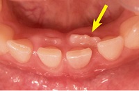 ただ上顎前歯部で歯茎が肥厚してなかなか生えてこない場合や左右差が著しい場合は要注意です。片方の永久歯が生えて半年ほど経過しても反対側の乳歯が残っている。この場合は、歯の真ん中がずれてしまう可能性が考えられます。