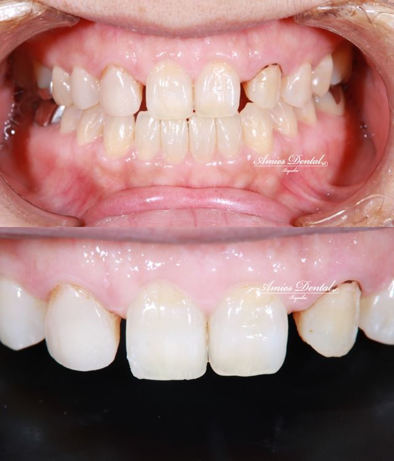 前歯2本をジルコニアで修復、ホワイトニング2回、歯茎のメラミン色素をレーザー除去、平行して歯肉炎の治療を行いました。歯茎が回復した後、根元の虫歯はダイレクトで修復しました。