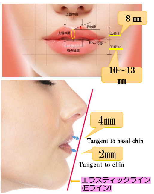 - 唇両側は黒目の内側端を下に下ろした線上周囲