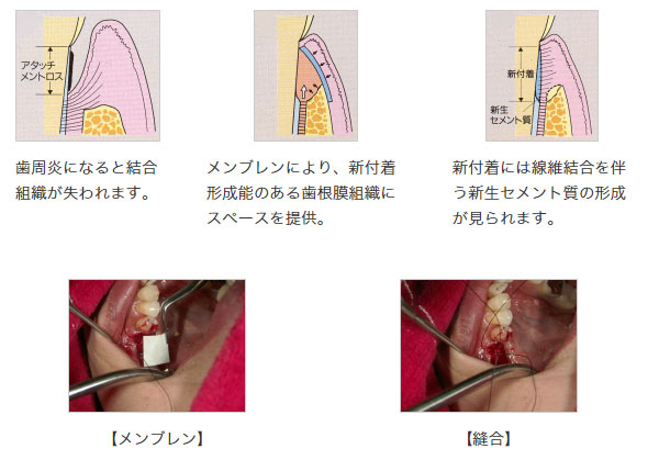 歯周病によって失われた歯と歯の周りの組織の付着を再生させるという治療法です。吸収性と非吸収性の膜があります。